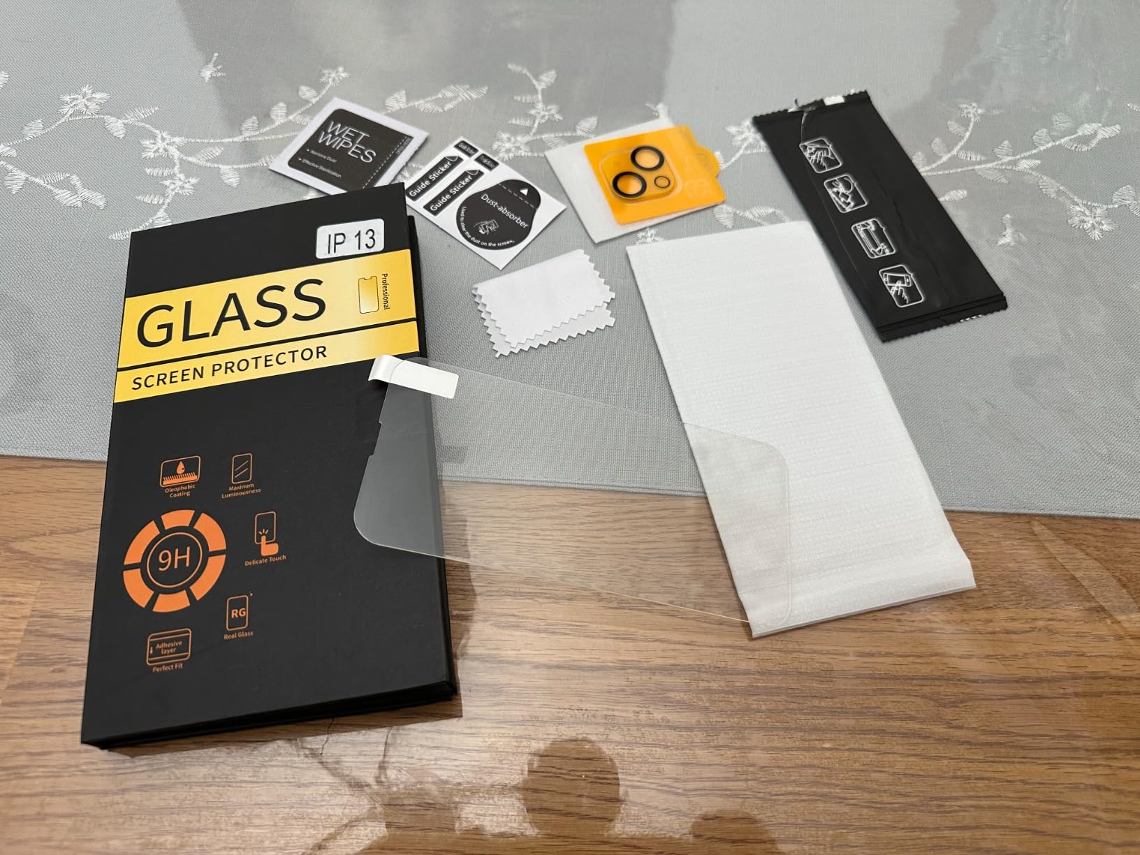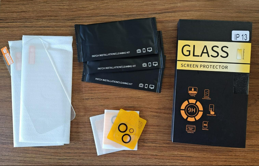 It comes with everything you need: cleaning wipes, dust stickers, dry cloth, guide stickers, front cover and camera cover. The camera cover was the easiest thing in the world to put on. The front sticker is a little harder, but I have that trouble with all of them, so that's just my clumsy fingers. Even with my usual struggles, it still went on with very few air bubbles. It looks good, and I hope it lasts longer than my last one!